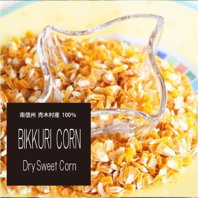 びっくりコーンが大好き!!今や我が家の常備品。 10袋まとめて買って<送料無料>♪ (沖縄・離島を除く) 高原の太陽をたっぷり浴びて育ったトウモロコシを乾燥して、手軽にいつでも甘いコーンを楽しめるようにしました。 標高850mの売木村では昼夜の寒暖差が激しく、ここで栽培するトウモロコシは栄養を一生懸命蓄えようとしてとても甘くなります。 まずはそのまま食べてみてください。 名前の通り「びっくり!」な甘さです。 食品添加物は一切使用していませんので、お子様の安心安全なおやつとして、またスナック感覚のお菓子、おつまみとして人気があります。 汁気を含むと、これまた「びっくり!」するほど、もぎたてのようなコーンの粒に戻ります。 ラーメンやチャーハンの具に、サラダのトッピングに、台所に常備しておくと便利です。 もちろん、牛乳などで煮込んで裏ごしして甘いコーンスープにもできます。 リピーターさんに人気の食べ方は、ご飯を炊く際に大さじ1杯程度をまぜるだけでできる「トウモロコシご飯」。 ほんのり甘くて、お子様に大好評。 製菓製パンの材料として、コーンブレッドなどにもお使いいただけます。 アイディア次第で「びっくり!」なレシピがたくさん生まれる「びっくりコーン」。 ぜひ台所の常連に加えてみてください。 <超簡単!なのに大満足。びっくりレシピ> ■たっぷりコーン入り中華ス―プ 1. 2カップ分の鶏がらスープを鍋に用意する。(顆粒ダシでOK) 2. スープ200mlほどを別の容器に移し、その中にびっくりコーン大さじ1杯ほどを入れておく。(汁気を吸って戻ります) 3. 卵2個分の溶き卵を作る。 4. 鍋の鶏がらスープを一度沸騰させてから弱火にし、溶き卵を入れてゆっくりと混ぜる。 5. びっくりコーンを入れて軽くひと煮立ちさせる。 6. お好みで塩コショウを加え、胡麻油を少々いれて香りをつける。 ************************************************* 【商品詳細】 商品名:びっくりコーン 原材料:とうもろこし(売木村産) 容量:一袋につき100g(とうもろこし約2本分) 保存方法:高温多湿を避けて常温で保存 【ご注文商品の同梱について】 他の常温商品と同梱可能ですが、米商品との同梱に際しては米商品の送料を頂くことになりますのでご了承くださいませ。 漬物など冷蔵品とは同梱できません。 システムの都合上、同梱時の送料が合計金額に反映されない場合がありますので、ご注文後にショップより確認のご連絡をさせていただく場合がございます。